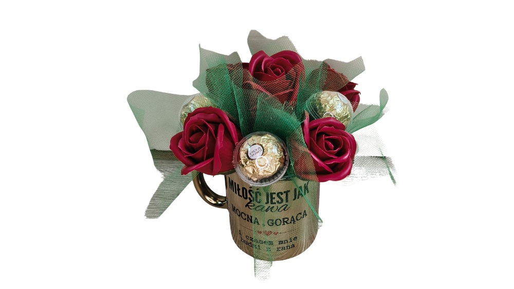 Elegancka kompozycja prezentowa: złoty kubek z romantycznym napisem, 5 pachnących czerwonych róż mydlanych oraz kulki Ferrero. Idealny prezent z efektem WOW.
