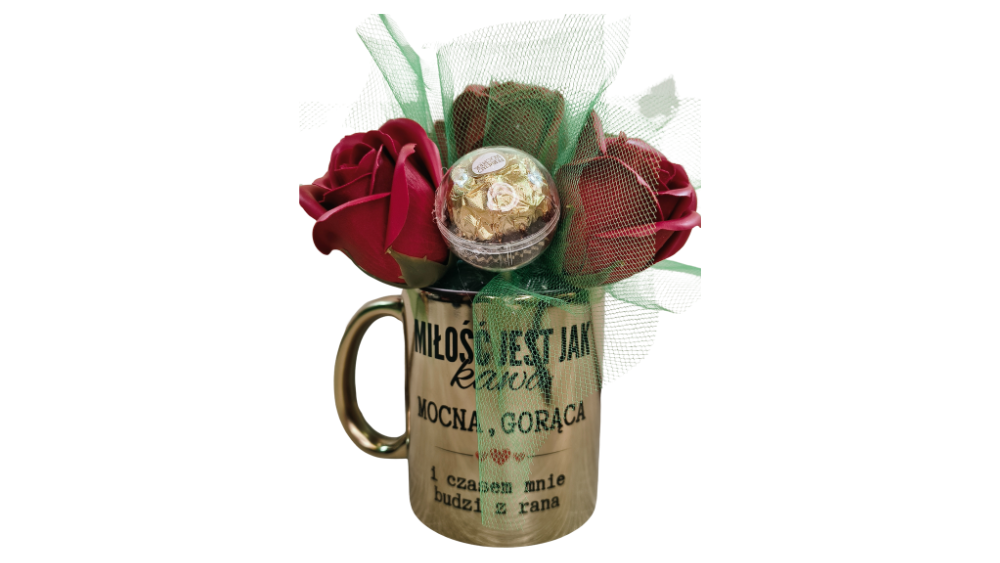 Złoty kubek z napisem „Miłość jest jak Kawa, mocna, gorąca i czasem mnie budzi z rana” w połączeniu z czerwonymi, pachnącymi różami mydlanymi oraz kulkami Ferrero tworzy elegancki i romantyczny zestaw prezentowy.