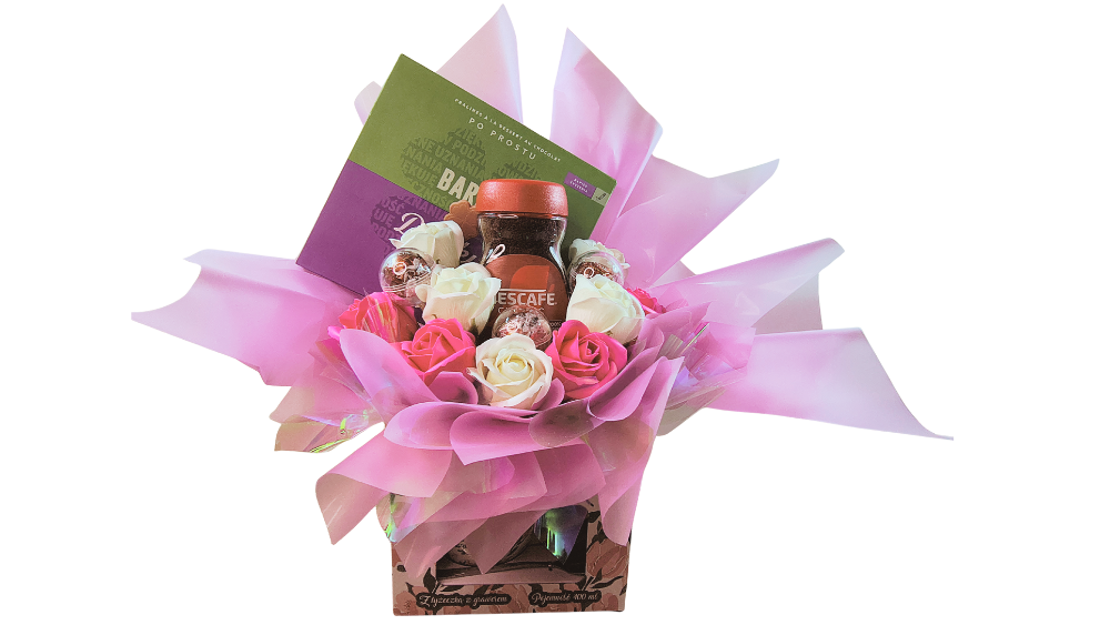 Całość uzupełniają aromatyczna kawa Nescafe Classic, wykwintne pralinki, czekoladowe kulki Lindor oraz pachnące róże mydlane, tworząc luksusowy, spójny i niezwykle estetyczny box prezentowy premium.