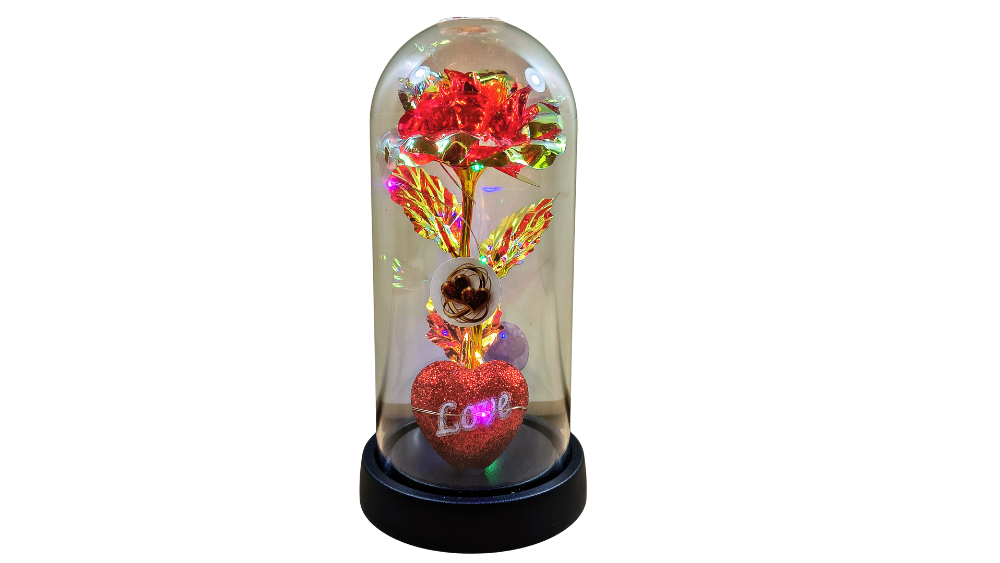 Błyszcząca róża podświetlana subtelnymi lampkami LED, uzupełniona sercem z napisem LOVE, została zamknięta w szklanej kopule, tworząc niezwykle elegancki, romantyczny i luksusowy prezent.