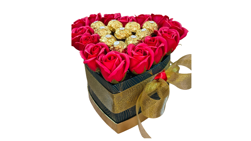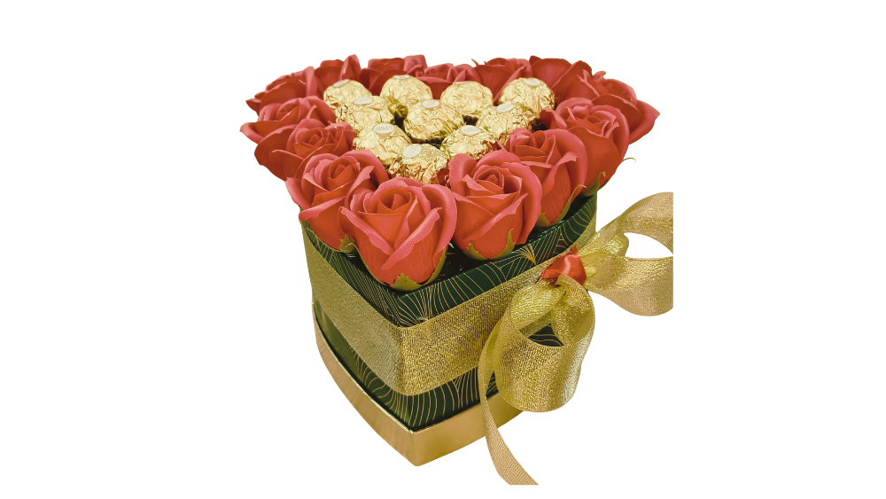 Zielono-złoty box w kształcie serca wypełniony czerwonymi, pachnącymi różami mydlanymi oraz kulkami Ferrero to luksusowa kompozycja idealna na romantyczne i ważne okazje.
