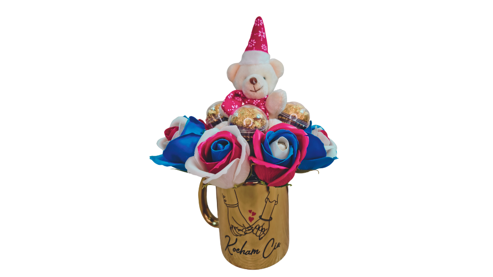 Złoty kubek z napisem „Kocham Cię” nadaje całości romantycznego charakteru. Towarzyszy mu biały pluszowy miś, który symbolizuje czułość i bliskość. Kompozycję dopełniają kolorowe, pachnące róże mydlane oraz 3 kulki Ferrero, które dodają słodkiej przyjemności.