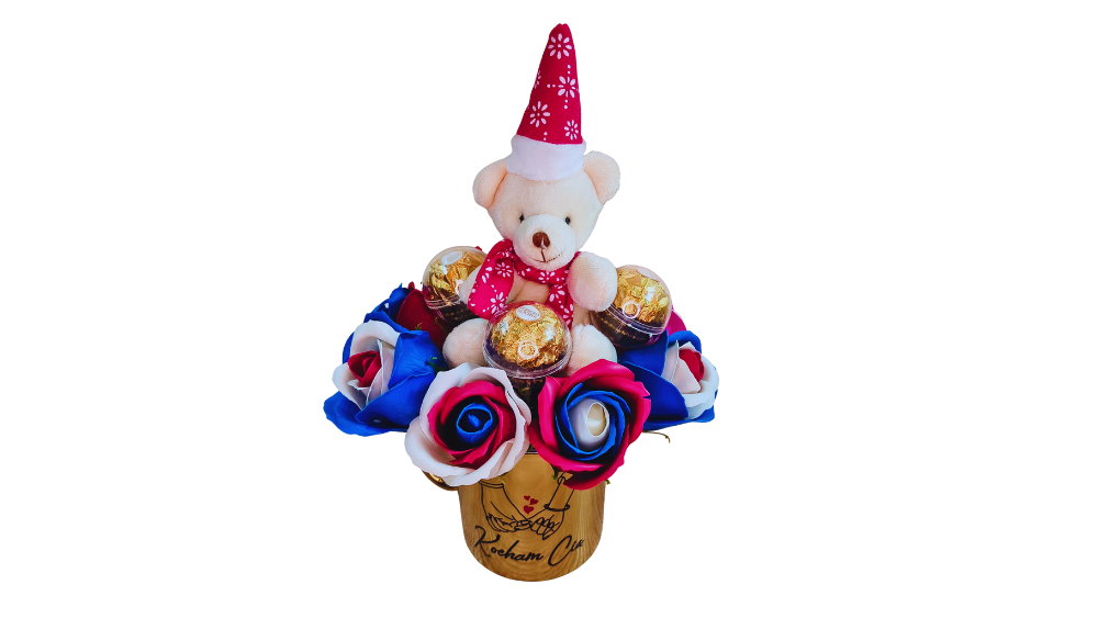 Ta elegancka kompozycja prezentowa łączy symbol miłości, słodycz i uroczy akcent, tworząc niezapomniany upominek dla bliskiej osoby.