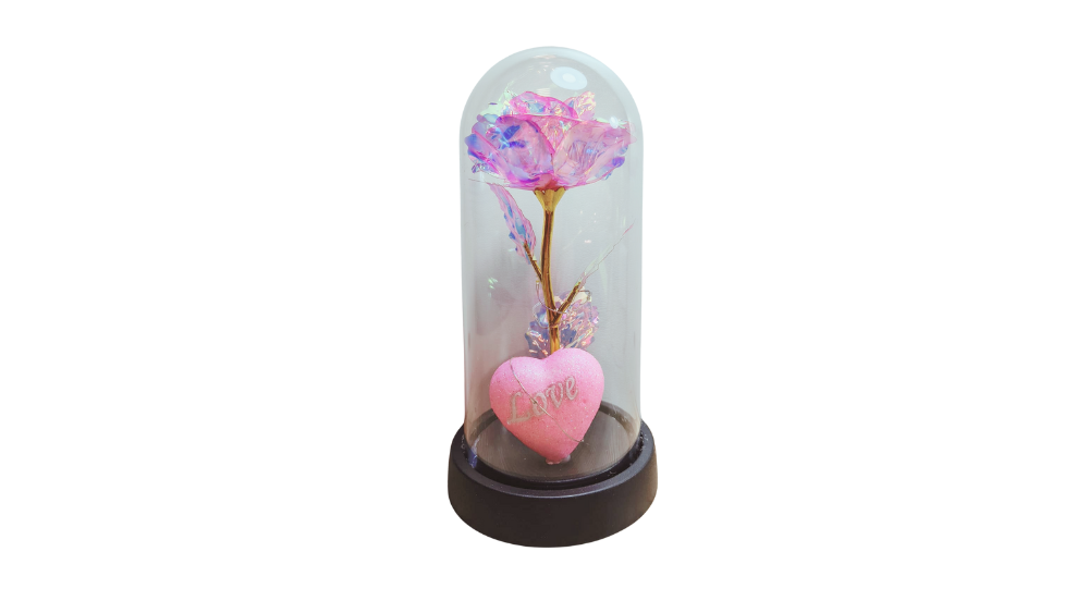 Delikatna różowa róża z subtelnym podświetleniem LED oraz brokatowym misiem z napisem LOVE, zamknięta w eleganckiej szklanej kopule. Idealny romantyczny prezent na Walentynki, imieniny i rocznicę.